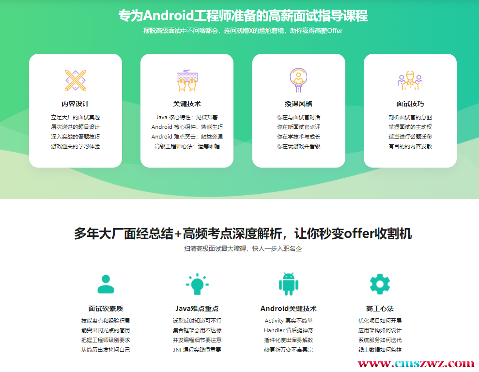 课程专为Android中高级工程师打造,针对面试中可能遇到的关键知识,进行深入分析讲解,为面试者还原面试官视角,带领面试者打开视野,快速在面试中突出亮点取得高分,拿下高薪。