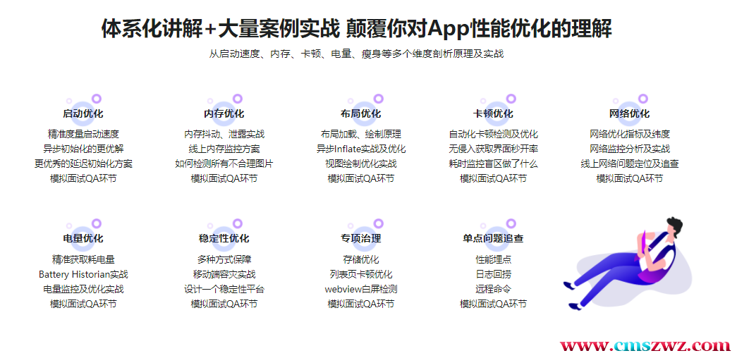 课程将从启动速度、内存、卡顿、电量、流量、瘦身等多个纬度进行原理剖析以及解决实战,同时每个章节还配备了模拟面试环节,颠覆你对性能优化的理解,最终让你的技术能力和优化经验得到前所未有的提升。