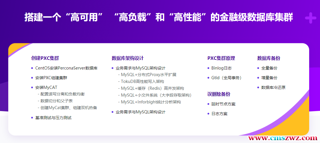 本课程将在Linux环境下,带大家学会搭建三高特点的PXC集群。此外,还会学习用PXC集群解决数据库领域的一些疑难问题,比如说冷热数据分离、大数据归档、海量数据导入等等,并带领大家领悟数据库架构设计的诸多方案。