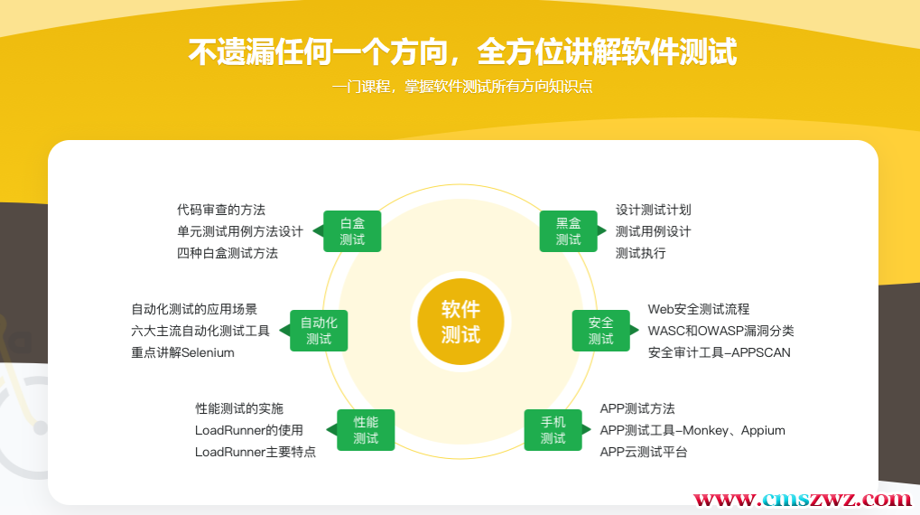 本课程将分别从测试设计、测试执行、测试总结、黑盒测试、白盒测试、自动化测试、性能测试、手机测试、面试讲解等全方位多角度的讲解,辅助以支付宝、余额宝、共享单车等实战项目演练,带领大家进入软件测试行业的殿堂,成为一个优秀的软件测试工程师。