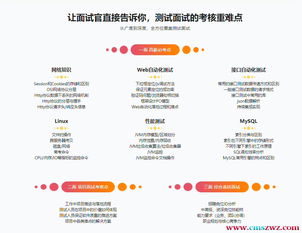 课程主要以面试流程为主线。从面试官的角度为大家讲解,面试中的重难点以及注意事项。全方位无死角的打造你的面试技巧,以及每一个技术细节。课程除了面试技术点外,更有面试指导,以及大厂内荐,让你不惧面试,稳拿offer。