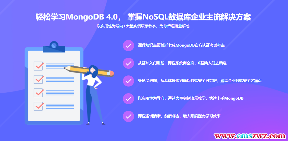 MongoDB凭借着其灵活性,可扩展性,强大的查询语言以及优异的性能,成为了众多开源项目和企业应用的主流选择。本课程采用渐进式教学,带领同学从零基础到进阶:课程涵盖众多知识点,带你步步为营,全面掌握NoSQL数据库解决方案。让你从小白到达人:最终助你快速成长为一名符合企业用人需求的人。