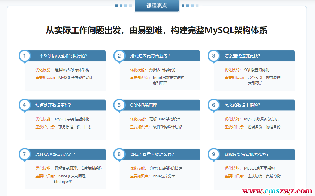 本课程从单点到集群,由浅入深,带大家深入理解MySQL原理,并学会多种不同的MySQL性能优化技巧,最终学会搭建高并发、高性能、高可用MySQL集群,从容应对实际工作中各种复杂的数据库问题。从实际工作问题出发,由易到难,构建完整MySQL架构体系