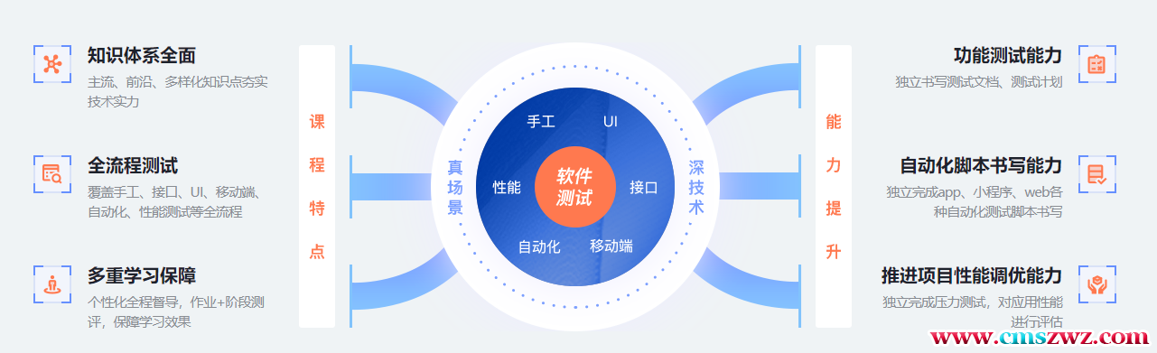 课程知识体系完备,从计算机基础,到功能测试,再到自动化测试,课程涵盖测试工具使用、测试原理讲解、自动化测试框架的实现等,同时覆盖多业务领域,如:电商、金融、小程序等