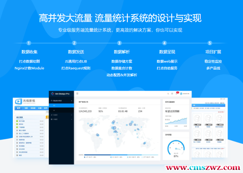 流量统计系统应用于成型互联网公司线上流量统计,本章节带领大家搭建一套含有一万多条数据的视频网站,整站嵌入用户信息上报JS,实时上报用户浏览情况,用于服务端统计分析。