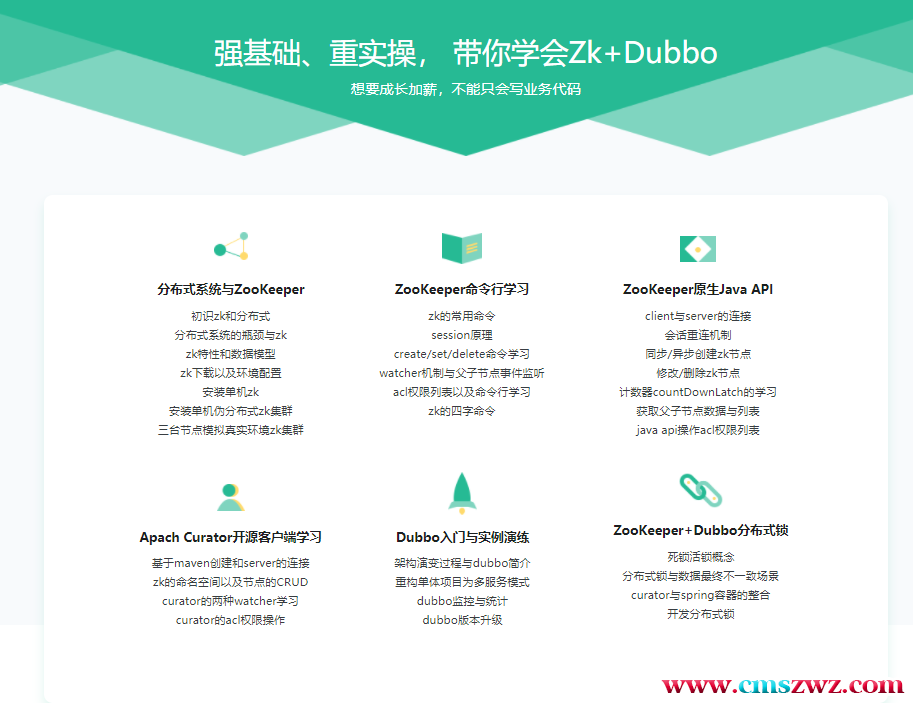 ZooKeeper是一种分布式协调服务,它用简单的架构和API,解决了分布式环境中协调和管理服务的难题。本课程带你系统学习ZooKeeper,并结合Dubbo,实践服务治理和分布式锁,带你入门ZooKeeper+Dubbo的服务治理。