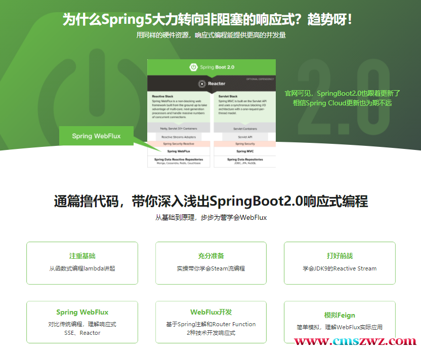 北京时间 3 月 1 日,SpringBoot2.0 正式发布。作为 Spring 生态中的重要开源项目, SpringBoot2.0 中加入了众多令人激动的新特性,其中最亮眼的,莫过于使用 Spring WebFlux提供响应式 Web 编程。本课程从基础讲解到实践,带你玩转SpringBoot2.0响应式编程。
