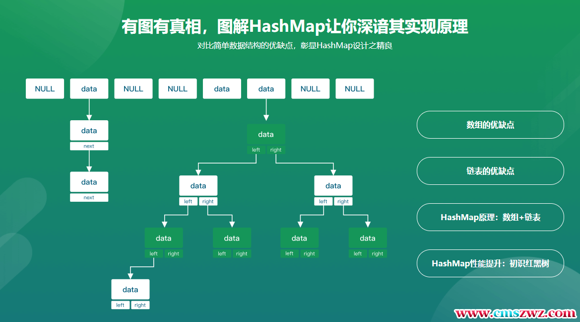 再复杂的问题背后也都是由简单的问题组成的,本章节通过图示了解各数据结构的优缺点,然后将其组合成我们课程的主题-HashMap,可以直观的了解到HashMap的实现原理,最后掌握面试常考,工作常用的HashMap冲突解决办法。