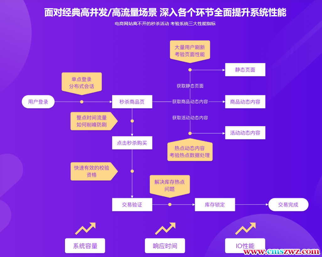 课程中借由“电商秒杀”案例,通过多种性能优化技术,总结了互联网项目中“秒杀”的经典性能优化方案技术,提供了统一的设计思维和思考方式,帮助同学们真正理解性能优化中每个技术的使用以及背后的原理。