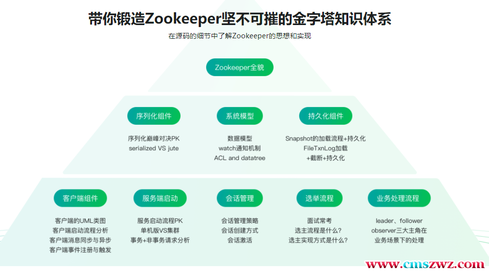 Zookeeper作为阿里系与Dubbo完美搭配的注册中心,其江湖地位毋容置疑。本课程以最开始图解Zookeeper框架的架构和组件作为课程总起,进而“分而治之”各个击破Zookeeper框架的各个组件源码,如:序列化,数据模型,持久化,Client和Server架构、选举流程等,最后通过总结快速梳理所得。