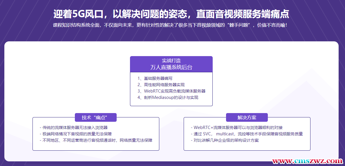 本课就将围绕与浏览器互通、级联、可扩展等6大痛点手把手带你学习大负载、高并发、高性能 WebRTC 流媒体服务器的设计与开发,揭秘万人互动直播背后的深层奥秘,打造可负载百万用户量的企业级的流媒体服务器。