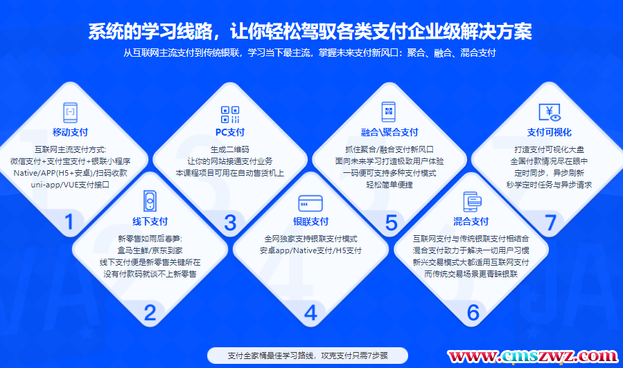 带你实战移动端、PC端、H5等多终端支付系统,对接各类真实业务系统,如外卖、电商、订票等各行业的业务系统,并支持微信、支付宝、银联、融合支付、混合支付等多种企业级支付模式