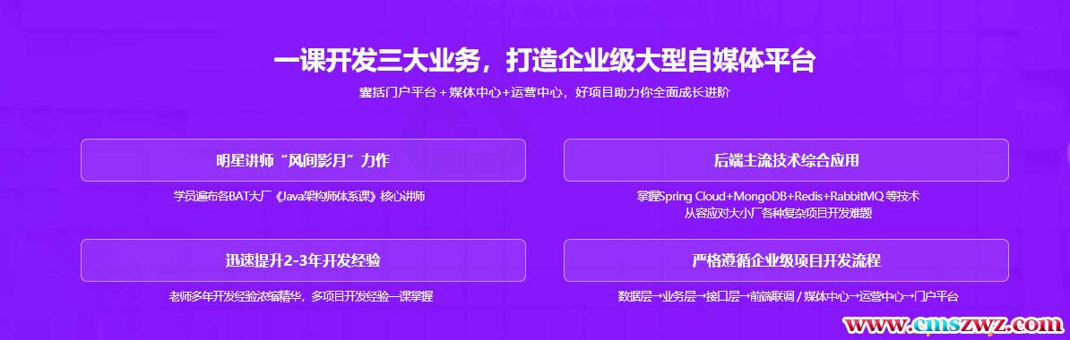 Spring Cloud分布式微服务实战,打造大型自媒体3大业务平台,以前后端分离模式,严守企业级架构和规范,开发门户平台+媒体中心+运营中心三大业务平台。掌握主流后端技术栈:Spring Cloud+MongoDB+Redis+RabbitMQ等应用,获得微服务、分布式、项目和微架构综合实战经验。一课开发三大业务,打造企业级大型自媒体平台