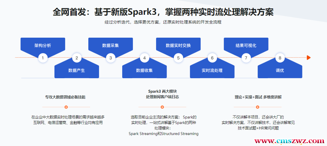 基于Spark3,在同一项目中,学习两套实时处理的解决方案:Spark Streaming和Structured Streaming,体验完整实时处理方案的全流程,为你梳理大数据常见面试题、大厂的实时解决方案,带你跨过面试最后一公里。全网首发:基于新版Spark3,掌握两种实时流处理解决方案