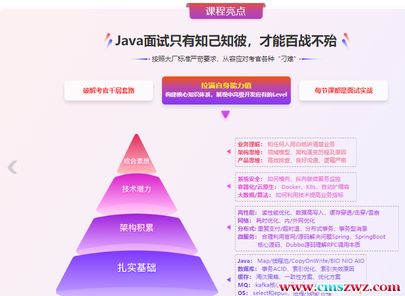 本课采用大厂多轮面试形式贯穿主线,内容涵盖Java中高级面试的必考点、高频点、加薪点。同时融合讲师多年阿里字节考官经验,通过真实模拟不同面试场景,将面试跳槽就是要高薪,面试就要面大厂每个环节和应对心得逐一讲解,助你突破自身瓶颈,超常发挥,顺利通过大厂面试。