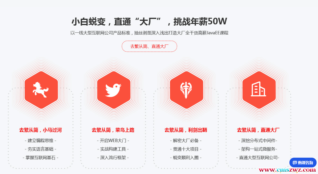 以一线大型互联网公司产品标准,抽丝剥茧、去繁从简、深入浅出打造全干货高薪JavaEE课程。 无论你是未就业的学生还是想转行的在职人员,无需脱产学习,按部就班、直通大厂,挑战年薪50W!截图: