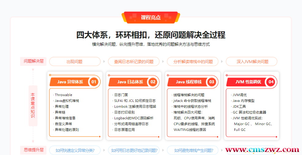 从日志、堆栈再到 JVM,系统提升解决异常问题和调优能力。掌握Java异常分析与调优方案,遇见Bug不再慌。项目异常不断,找不到问题所在?百度、Google搜个遍,也找不到答案?本课程针对Java开发中常见的各种异常,从日志、堆栈再深入到JVM,带你发现问题、定位问题、解决问题,最后在实战中搭建开箱即用的SpringBoot脚手架,强化巩固所学,助力你提升开发技能!