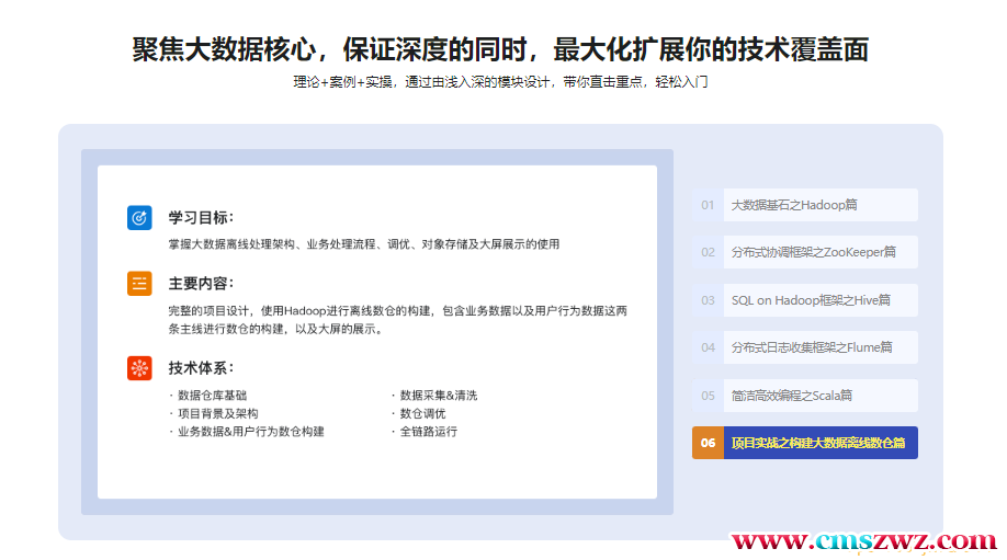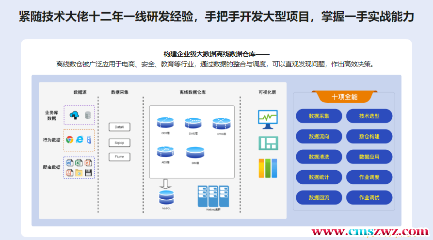 大数据在互联网与工业领域的价值不用赘言,随着人工智能、区块链等技术越来越火热,许多企业也加入了大数据的“抢人大战”。大数据技术栈众多,学习曲线陡峭,为了更好地帮你入门,我们将从大数据基石——Hadoop讲起,过渡到Hive,一步步掌握数仓、数据处理、离线开发等关键技能点,并最终通过一个大型项目的实战,带你进入大数据的世界!数千小时授课时长,众多学员口碑选择