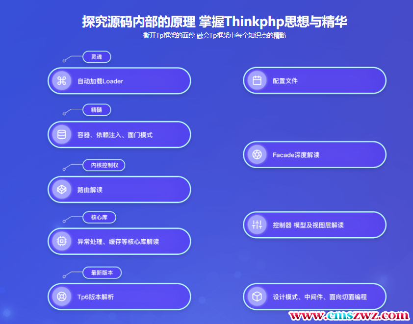 为解决大家对于TP框架底层源码的学习问题。singwa老师在本门课程为大家一步步分析ThinkPHP的底层源码,在分析的过程中,逐步提升技术水平。轻松应对不同的TP版本和不同的框架,掌握课程所授内容,可基本达到百度T5的水平。