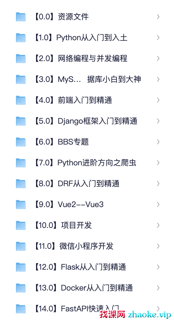 【0.0】资源文件【1.0】Python从入门到入土【2.0】网络编程与并发编程【3.0】MySQL数据库小白到大神【4.0】前端入门到精通【5.0】Django框架入门到精通【6.0】BBS专题【7