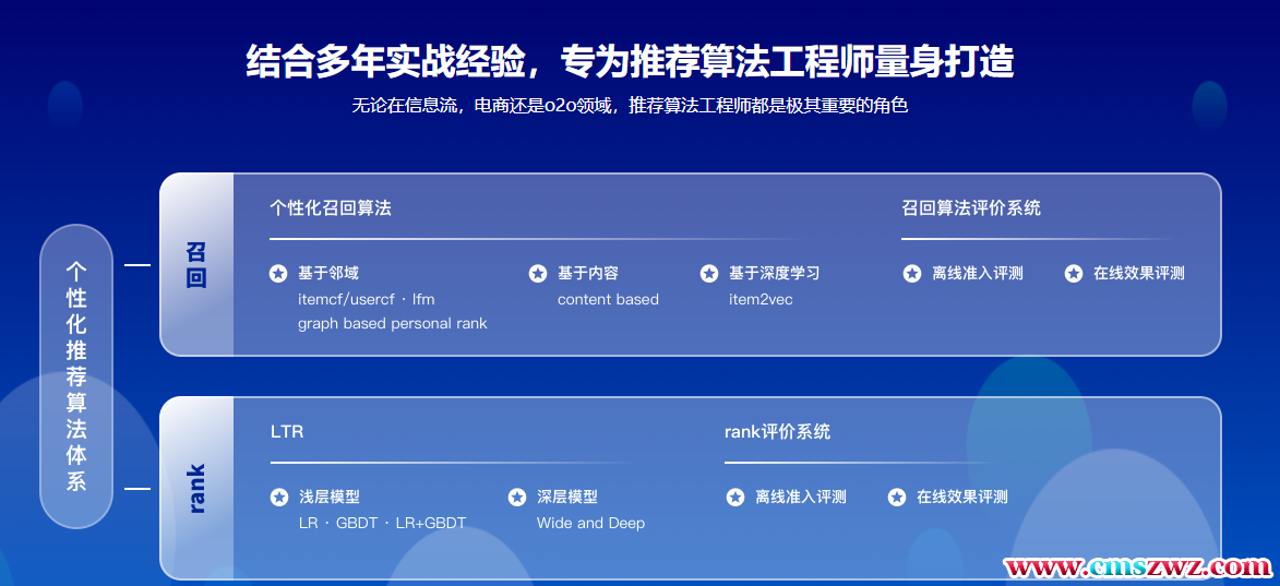推荐算法工程师已成为各个大厂炙手可热的岗位,社招起步薪资20k+!本课程,讲师从算法原理到代码实战,细致的讲解个性化推荐算法如何在开发中落地,让你可以建立起自己的推荐算法体系。同时也可以让你掌握算法公式,模型参数迭代等技术的微小细节。