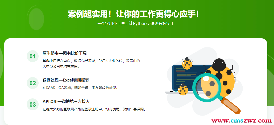本课程使用Python开发了图书比价、Excel实现报表、微博第三方接入三个超实用工具。从项目设计到案例的开发完成,让你懂得项目开发思路,面对项目不再无从下手。