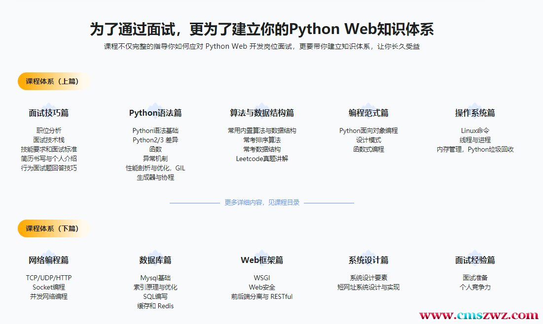 Python服务端工程师学什么,面试问什么,你该准备什么?别苦恼,别害怕,别纠结,这门课程带你系统梳理面试知识,增加面试成功几率,提升后端开发技能,在面试之前解决你的各种问题,让你技术实力和面试技巧得到双重提升。