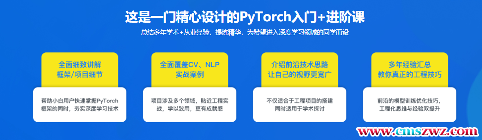PyTorch是深度学习的主流框架之一,新手入门相对容易。课程将算法、模型和基础理论知识进行有机结合,结合多个不同的CV与NLP实战项目,帮助大家掌握PyTorch框架的基础知识和使用方法,带大家较平稳地入门深度学习领域。