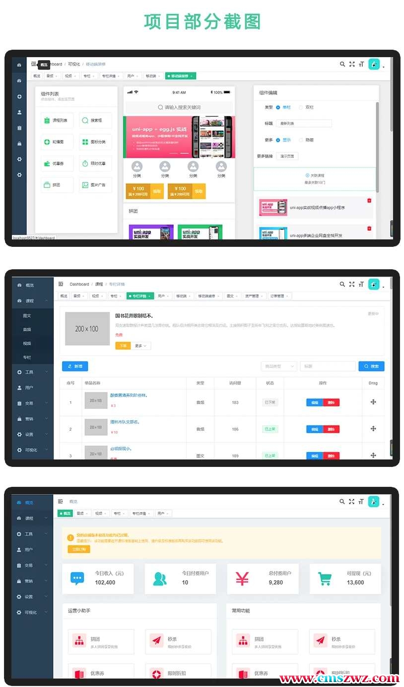 VueCli实战在线教育后台系统课程概述本季度基于vue-element-admin实战开发在线教育后台系统,课程包括:图文,音频,视频,电子书、会员、直播、问答、题库、拼团秒杀、优惠券、可视化拖拽管理多端(PC端 + 移动端)。课程涉及vue + vuex + vue-router + vue-cli + axios + element-ui + Mock.js等内容。