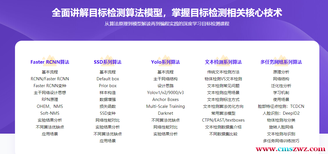 课程从算法角度出发,对各个模型进行全面细致的讲解,并结合人脸检测、物体检测、行人车辆检测、文本检测等项目,熟悉算法工程师在工作中会接触到的数据打包、网络训练、测试等问题,一步步带大家了解和完成目标检测实战案例,尽快进入深度学习领域。