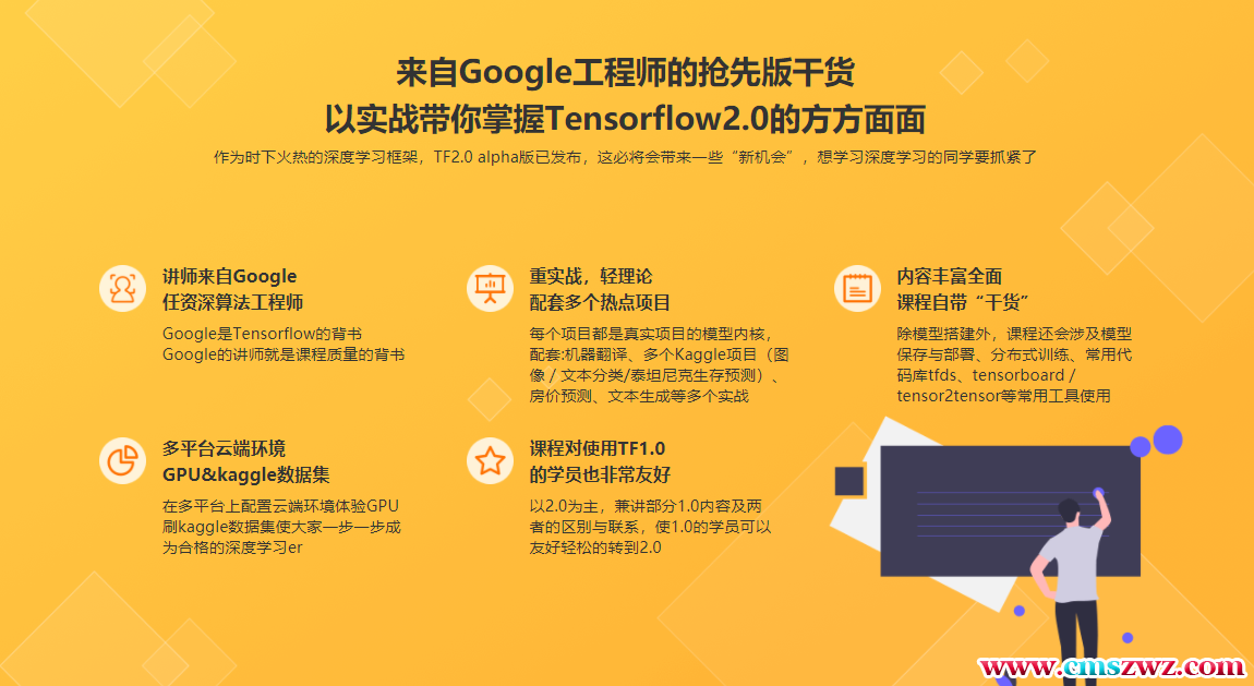 课程以Tensorflow2.0为主体,以图像分类、房价预测、文本分类、文本生成、机器翻译、泰坦尼克生存预测等项目为依托,讲解Tensorflow框架的使用方法,让学员获得灵活使用Tensorflow的能力,达到初级深度学习工程师的水平。