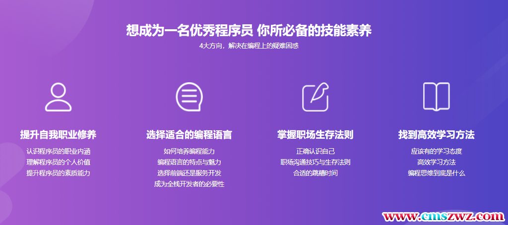 框架层出不穷,技术版本迭代堪比脱发的速度,在这里老师结合十年的编程经验,高效学习方法倾囊相授。除此之外,软实力怎么提升,综合素养体现在哪,如何提升,实现自我价值,都有涉及。