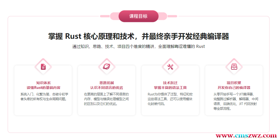 Rust是一门很有前途的明星语言,但同时又以高难度、高门槛而著称,劝退了不少自学者和有需求的开发人员。本课程将带你从基础入手,通过平缓的学习曲线和丰富的案例,并以编译器作为实战项目,让你熟练掌握 Rust 的应用,并有能力解决实际开发中的各种复杂问题。