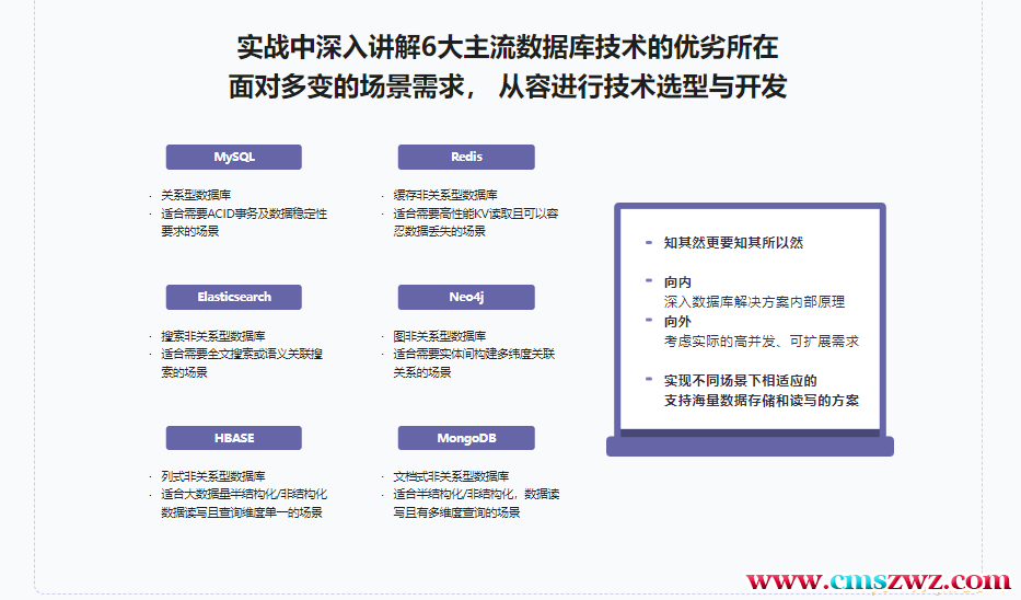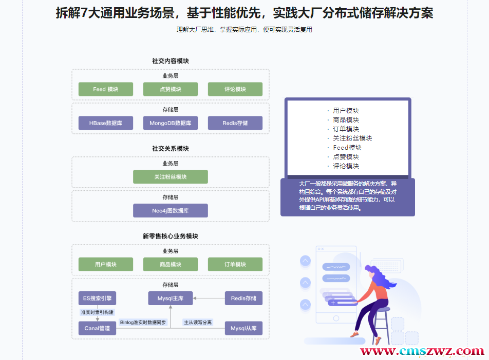 优秀的后端开发工程师,对于数据库存储方面,光会常规的CRUD已然不够,更需要懂各种数据库产品的优劣及适用场景,并能在适合的业务实践中准确选取合适的产品并应用。本课程利用一个社交新零售项目,带你学习如何基于不同的业务场景侧重的模式选择合适的数据库,并使用合适的设计形式,提升项目质量。