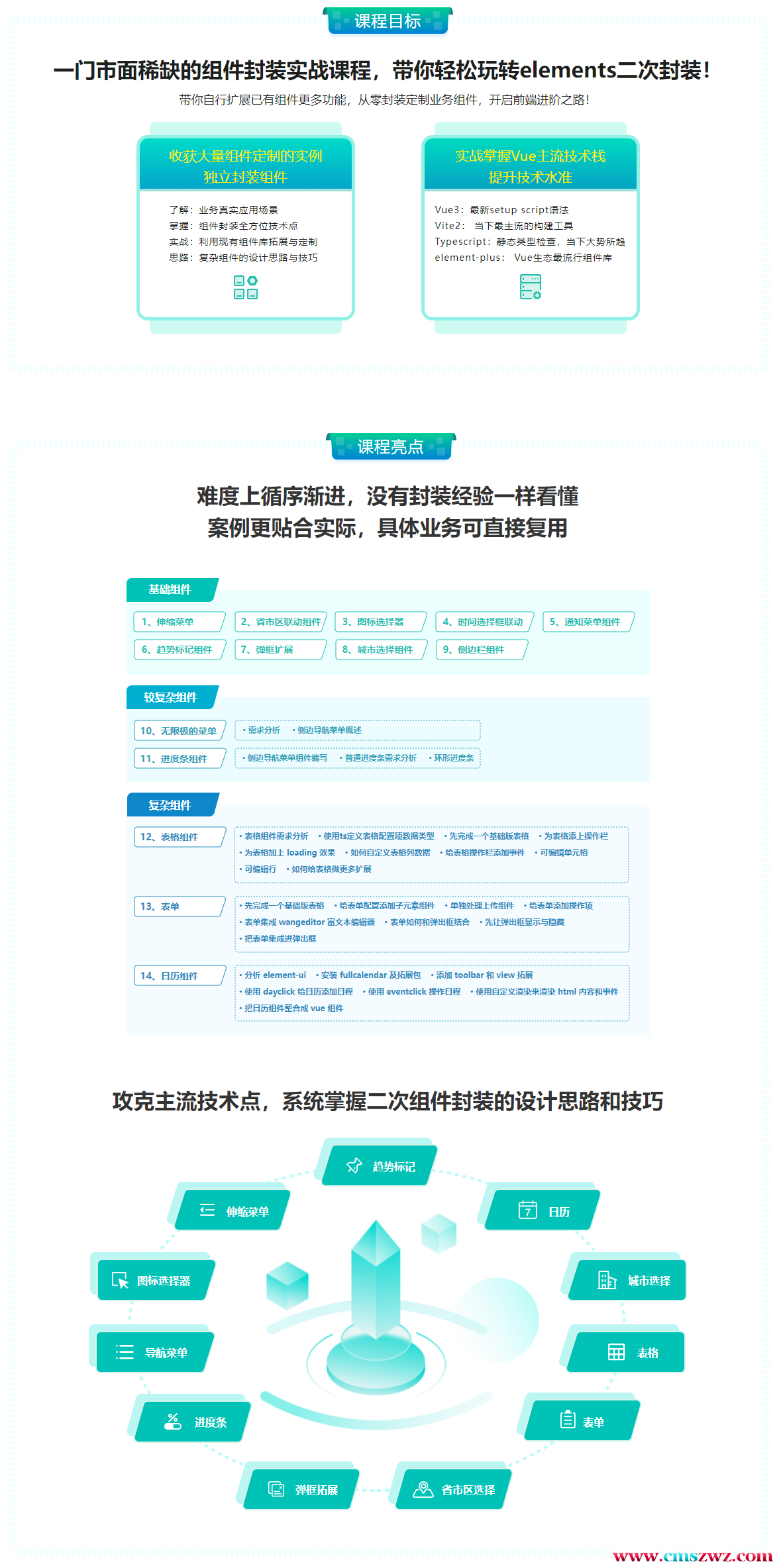 很多前端开发者只会调用element-plus组件库已有组件,在面对需要定制的场景,或者想要简化使用组件的时候,就会无从下手。本课程深度结合前沿技术栈Vue+Vite+TS,全方位讲解二次封装的思想、技巧、组件设计等,并提供了大量封装实例,帮大家掌握组件的二次封装,实现前端进阶!