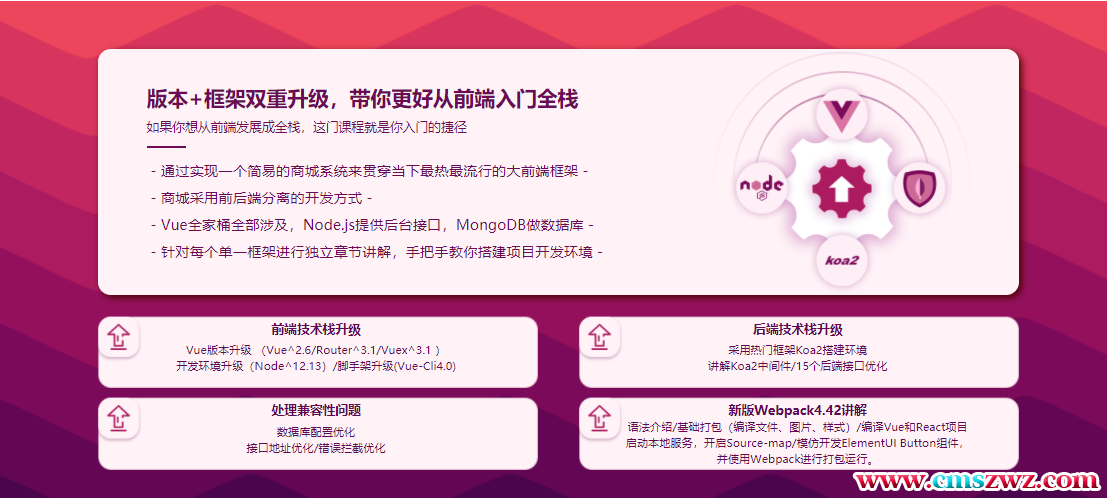 本课程前后端兼顾,用Vue.js、Node.js、Koa、ES6等热门前端技术结合MongoDB,完成前后端开发,作为全栈入门和毕业项目再好不过。让你顺畅地从前端晋级到全栈,让你的职业道路更加宽广,让你的未来发展有更多可能!