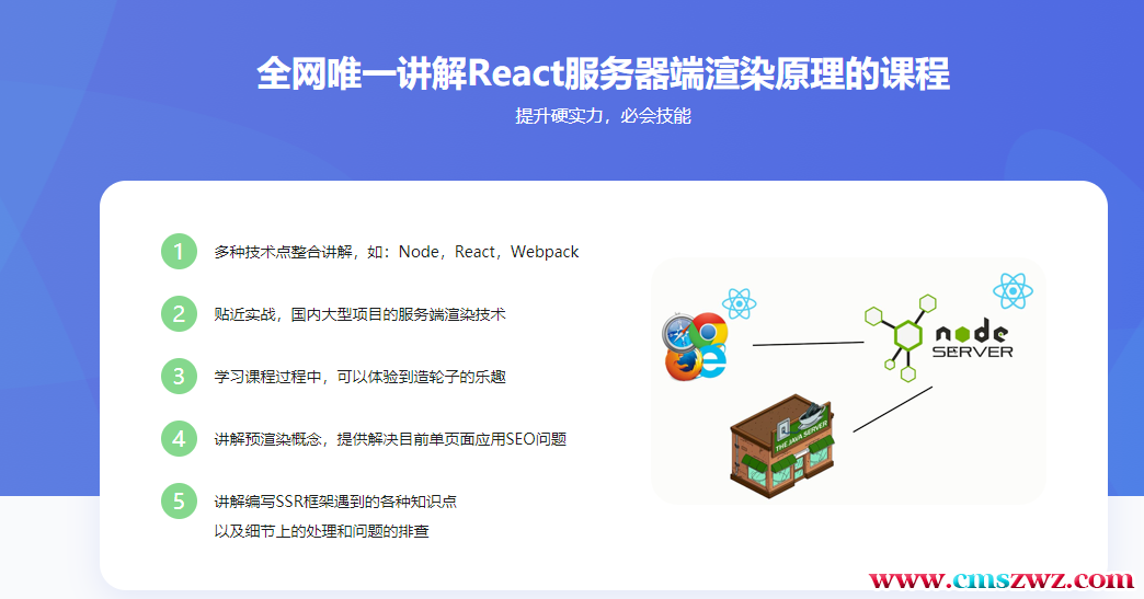 本课程讲解React中SSR技术的整个搭建思路及流程,从原理上讲清楚SSR的概念,重点讲解编写SSR框架遇到的各种知识点,以及细节上的处理和问题的排查。课程学习完成,大家可以搭建属于自己的SSR工程架构。