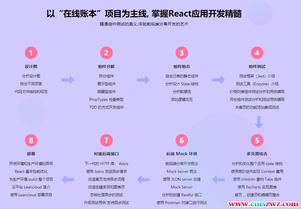 本门课以”在线账本”为实战项目,以 ‘React理念’为指导思想,让大家从头到尾的实践一个项目是怎样从设计图到最终的线上产品。课程将一步一步带你从设计图出发,到组件拆分,组合,状态分析,数据流分析,组件测试、页面整合,再到搭建 Mock Server,对接后端接口,实现前后端分离开发,最终到部署上线。由浅入深的学习 React 的实际应用的开发模式和流程。