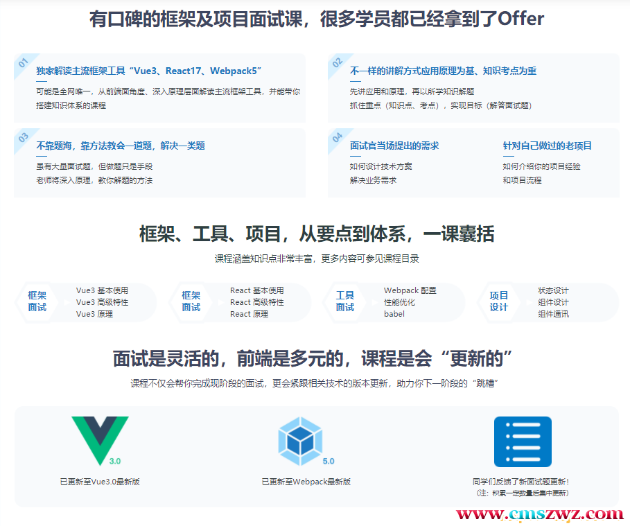 现在的前端面试几乎必考Vue、React 和 Webpack框架内容,对于求职者 是刚需。在这三者的基础之上,还会考察能力方面,即项目设计和项目经验,最终才能通过。这就是这门课要解决的问题。