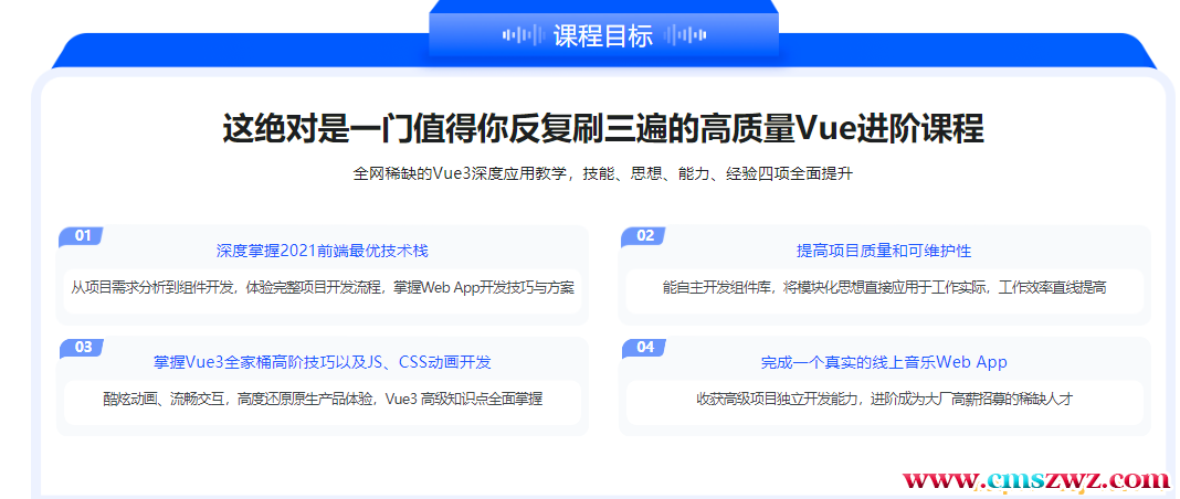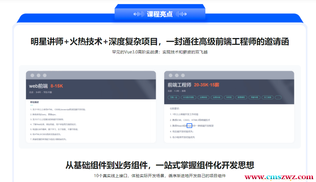 这绝对是一门值得你反复刷三遍的高质量Vue进阶课程。全网稀缺的Vue3深度应用教学,技能、思想、能力、经验四项全面提升。企业对Vue技术的要求越来越高,但掌握vue3.0高深技术的人才却很少。本课程将通过编写出一个真实的,高度还原音乐播放器的复杂前端项目,让你在实战中获得一线大厂vue3.0高级技术实际开发经验,助你在面试中脱颖而出。