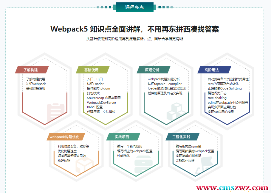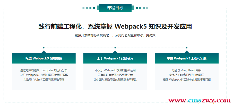 Webpack 作为一款可以提升开发效率、提高页面性能的工具,是前端开发者必备的技能。不过现实中还有很多前端同学对 Webpack的使用局限在调用阶段,对于其内部原理以及已有的配置不够了解,无法高效用好这个工具。本课程将通过一系列由浅入深的内容设计,帮助大家提升对 Webpack 的理解,并且能在实际业务中加以应用。