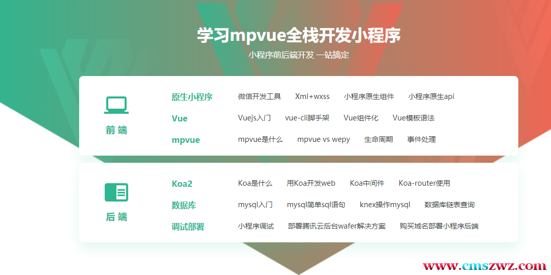 2018年3月,美团mpvue开源,是现在业内最火的vue开发小程序解决方案。慕课网第一时间推出,业内第一门mpvue全栈课程。结合腾讯云提供的小程序全套后端解决方案,从小程序+vue+Koa2的基础学习,到使用vue语法全栈开发一个小程序,完整的上线流程,使学生能直接上手开发一个完整的小程序并且上线,形成一个完整的知识体系。