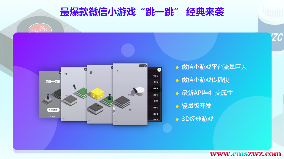 通过使用three.js开发“跳一跳”微信小游戏,以高仿真的实战,带你深入学习微信小游戏API、three.js框架、webgl,让你了解微信小游戏以及移动端的3D Web游戏是如何开发的,掌握这一类移动端3D小游戏的实现和性能优化