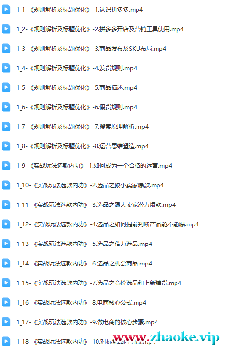 ├──1_9-《实战玩法选款内功》-1.如何成为一个合格的运营.mp4 66.84M├──1_10-《实战玩法选款内功》-2.选品之跟小卖家爆款.mp4 64.49M