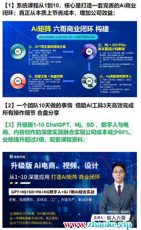 课程来自六哥的Ai终点站,全系统商业闭环矩阵打造,帮电商、实体降70%成本,12款Ai联合深度实战。说白了,你之前5个人的团队,当团队人数不变的情况下,借助于ChatGPT和各种软件的结合,赋能电商直播带货,可以让之前一年销售额2,000万变成2,500万或者是3,000万,这就是这套课程的核心作用。