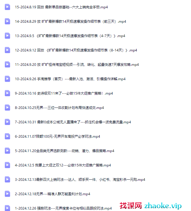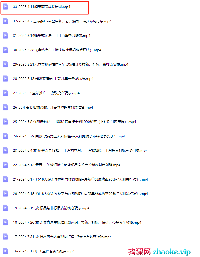 课程简介:淘天实战陪跑计划,旷旷老师弟子实操课!!落地的爆单计划#2025年4月13更新 淘宝商家成长计划#2025年4月2更新 全站推广—全店新、老、爆品一站式布局打爆#2025年3月22更新躺平式