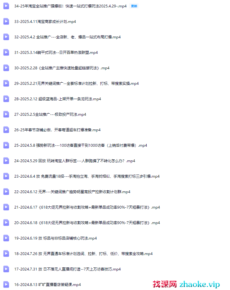 课程简介:淘天实战陪跑计划,旷旷老师弟子实操课!!落地的爆单计划#2025年4月30更新25年淘宝全站推广强爆啦!快速一站式打爆玩法#2025年4月11更新淘宝商家成长计划#2025年4月2更新 全站
