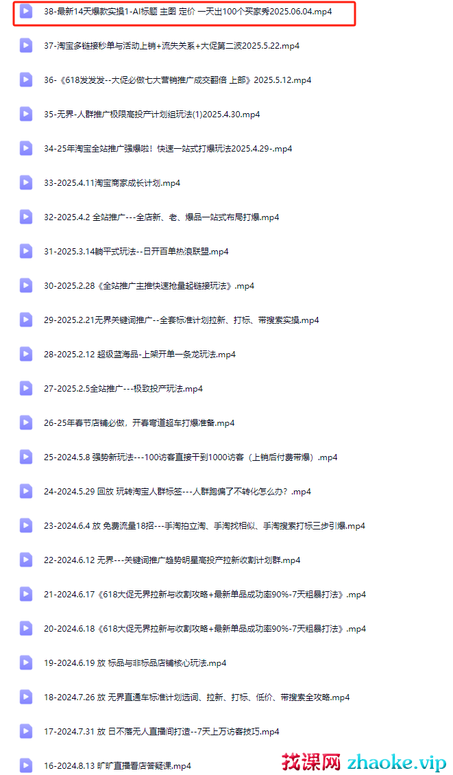 课程简介:淘天实战陪跑计划,旷旷老师弟子实操课!!落地的爆单计划6月5日更新-38-最新14天爆款实操1-AI标题 主图 定价 一天出100个买家秀2025.06.04.mp46月2日更新-37-淘宝