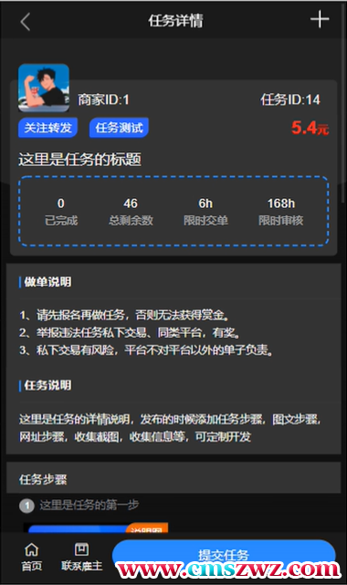 任务管理:包含平台的任务列表和用户任务列表,以及任务订单的相关管理。