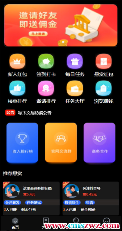 众人帮任务悬赏手机兼职平台系统源码运营版搭建即用+对接Z支付+视频教程功能介绍:仿市面上悬赏平台,基本功能都有,发布单,审核,支付,充值,提现,vip,置顶,推荐都有会员功能,任务设置,每日提现次数设置,统计相关:包含联盟的财务统计,任务反馈统计。用户财务统计,以及平台数据分析。任务分类:后台根据分类调用到幻灯片任务接口。自定义任务分类名称和任务导航图片。任务管理:包含平台的任务列表和用户任务列表